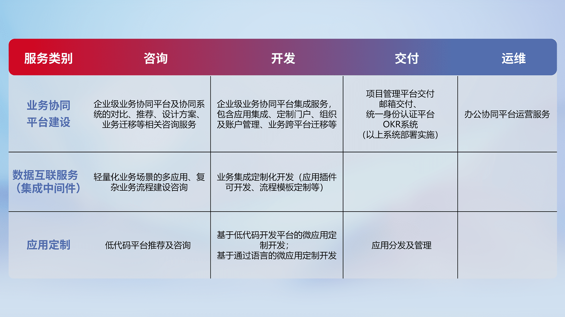 针对钉钉、、企微、、IDaas等平台级产品提供产品的规划、、、、方案、、、、交付、、、、定制化开发等服务,,,,实现如统一协同办公、、智能客户服务、、混合会议管理、、智能数据查询、、、等业务场景,,实现数字化转型。。。。
